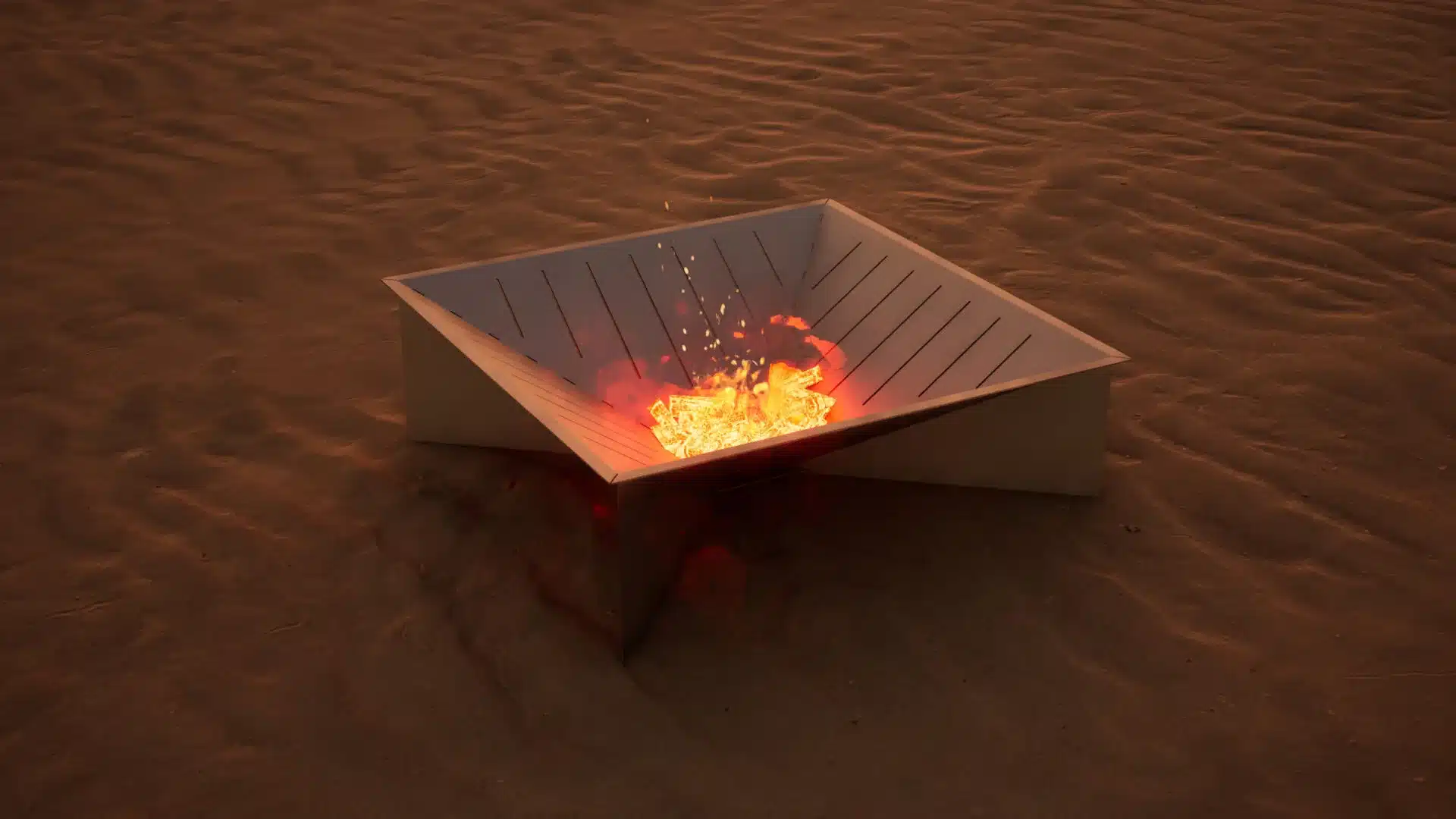 Meet the GEOMA Firepit: a striking, inverted pyramid design crafted from 11ga steel. Four sloping triangular panels converge downward to create the fire chamber, while a set of supports extend from each seam to the ground forming an X-shaped base from corner to corner—a clever structural twist that balances both form and function. Air slots are cut into the panels to keep the fire well-ventilated, ensuring a robust, long-lasting burn.